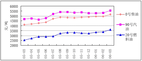 2006年,受各種因素作用的影響,國際油價持續(xù)在高位波動,3月份,布倫特原油(普氏現(xiàn)貨,下同)價格為61.2 美元/桶,同比上漲15.4%。成品油價格繼續(xù)上漲,95#無鉛汽油為68.9 美元/桶,同比上漲15.9%;柴油77.6 美元/桶,同比上漲16.1%。為緩解國內(nèi)成品油與原油價格倒掛的矛盾,3 月26 日,發(fā)展改革委再次提高成品油出廠價格,汽油、柴油價格分別提高300 元和200 元,調(diào)整后出廠價格分別為4700 元/噸和4070 元/噸,隨后,各地成品油價格紛紛上揚。3 月末,國內(nèi)市場0 號柴油價格平均為5179 元/噸,比2 月提高4.26%;國內(nèi)市場90 號汽油價格平均為5567 元/噸,比2 月份提高4.5%;20 號燃料油價格為3615 元/噸,比2 月份提高6.76%。國家調(diào)高成品油價格效應(yīng)顯現(xiàn)。