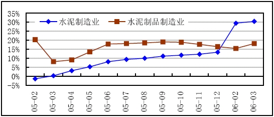 2005年以來水泥制造業(yè)和水泥制品制造業(yè)工業(yè)總產(chǎn)值增長對(duì)比