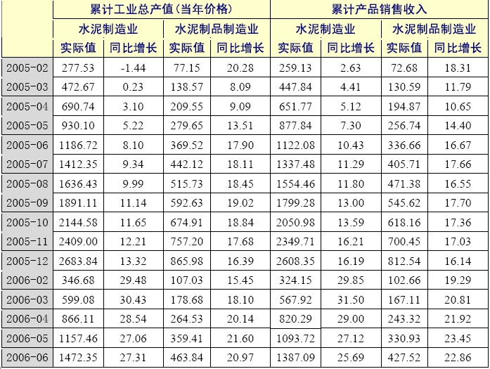 2006年1-6月,水泥制造業(yè)累計(jì)工業(yè)總產(chǎn)值1472.35億元,同比增長(zhǎng)27.31%,增幅比上年同期上升了19.21個(gè)百分點(diǎn);實(shí)現(xiàn)產(chǎn)品銷售收入1387.09億元,同比增長(zhǎng)25.69%,增幅比上年同期上升了15.26個(gè)百分點(diǎn)。 水泥制品制造業(yè)的產(chǎn)銷情況不如水泥制造業(yè),1-6月其工業(yè)總產(chǎn)值增速比水泥制造業(yè)低6.34個(gè)百分點(diǎn),產(chǎn)品銷售收入增速比水泥制造業(yè)低2.83個(gè)百分點(diǎn)。雖然水泥制品制造業(yè)的產(chǎn)銷增長(zhǎng)情況不如整個(gè)水泥制造業(yè),但是其產(chǎn)銷增幅還是好于去年同期。