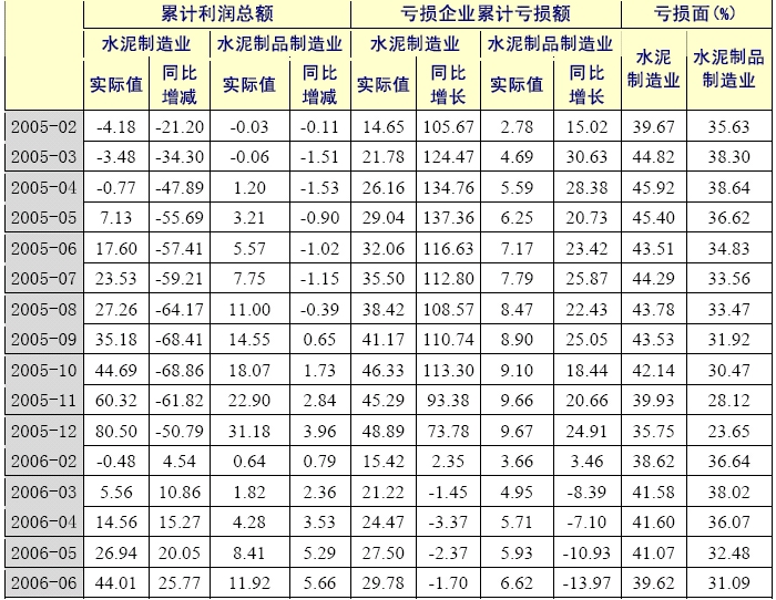 2006年1-6月,水泥制造業(yè)累計(jì)利潤總額為44.01億元,比上年同期增加了25.77億元;虧損企業(yè)累計(jì)虧損總額為29.78億元,比上年下降了1.70%;企業(yè)虧損面仍然較大,為39.62%,但是比上年同期下降了3.89個(gè)百分點(diǎn)。