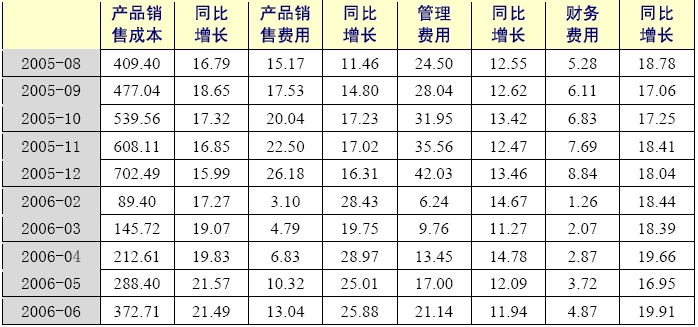 2006年1-6月,水泥制品制造業(yè)累計產(chǎn)品銷售成本為372.71億元,同比增長21.49%,增幅比上年同期上升了2.73個百分點;累計產(chǎn)品銷售費用為13.04億元,同比增長25.88%;累計管理費用為21.14億元,同比增長11.94%;累計財務(wù)費用為4.87億元,同比增長19.91%。除了財務(wù)費用增幅低于水泥制造業(yè),其他費用增幅均高于水泥制造業(yè),累計產(chǎn)品銷售成本增幅也低于水泥制造業(yè)。