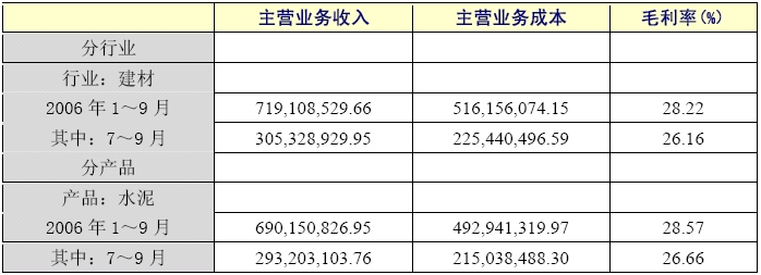 截至2006年9月30日,福建水泥股份有限公司共生產(chǎn)水泥252萬(wàn)噸,銷售水泥248萬(wàn)噸。2006年夏秋福建省在臺(tái)風(fēng)、強(qiáng)降雨等自然災(zāi)害過(guò)后,水泥需求穩(wěn)步增長(zhǎng),市場(chǎng)價(jià)格基本平穩(wěn),期末開(kāi)始上揚(yáng),公司水泥產(chǎn)、銷兩旺,單季開(kāi)始盈利。7-9月產(chǎn)、銷為95.86萬(wàn)噸和104.06萬(wàn)噸,同比分別增長(zhǎng)15.67%和22.88%。7-9月實(shí)現(xiàn)主營(yíng)業(yè)務(wù)收入305,328,929.95元、凈利潤(rùn)1,991,362.58元,同比分別增長(zhǎng)33.09%和77.09%。2006年1~9月,公司累計(jì)實(shí)現(xiàn)主營(yíng)業(yè)務(wù)收入719,108,529.66元,同比增長(zhǎng)30.53%,凈利潤(rùn)-29,133,304.20元,同比降低27.97%。