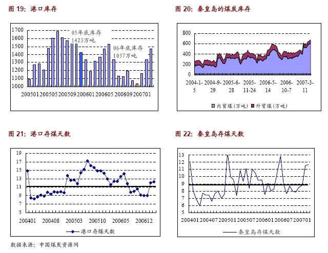 07年3 月份的港口庫(kù)存1473.9 萬(wàn)噸,較06 年底的1037.4 萬(wàn)噸上升了436.5 萬(wàn)噸(或42.08%)。截止到4 月22 日,秦皇島的煤炭庫(kù)存為672.1 萬(wàn)噸,較06 年底的440.6 萬(wàn)噸增長(zhǎng)了52.54%。與06 年6 月份的高位庫(kù)存相當(dāng)(當(dāng)時(shí)的高庫(kù)存直接導(dǎo)致了煤炭?jī)r(jià)格的走低)。