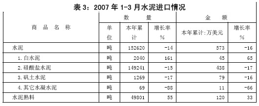 2007年1-3月全國(guó)共進(jìn)口水泥熟料49801噸,同比增長(zhǎng)55%;共進(jìn)口水泥152620噸,同比減少了14%,其中用途最廣的硅酸鹽水泥進(jìn)口149241噸,同比減少15%。具體情況見(jiàn)下表。若按1美元=7.72元人民幣估算,硅酸鹽水泥的平均進(jìn)口單價(jià)為226.57元人民幣/噸,水泥熟料的平均進(jìn)口單價(jià)為186.02元人民幣/噸。