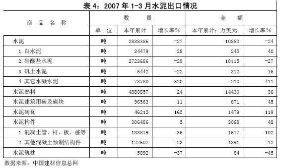與明顯回暖的國內(nèi)市場相比,國外水泥市場則略顯低迷。2007年第一季度全國共出口水泥熟料488.09萬噸,同比增長24%;水泥累計出口量為283.84萬噸,與去年同期相比下降26.53個百分點,其中硅酸鹽水泥出口272.37萬噸,同比減少29%。具體情況見下表。若按1美元=7.72元人民幣估算,硅酸鹽水泥的平均出口單價為287.07元人民幣/噸,水泥熟料的平均出口為228.24元人民幣/噸。