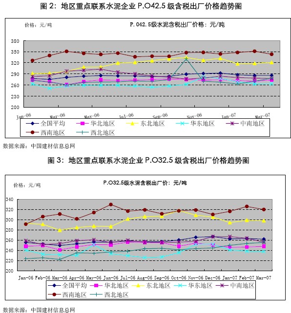 在煤電成本上升及需求增長的拉動下,2007年1-3月全國水泥價格呈現(xiàn)穩(wěn)步回升的態(tài)勢。其中2月份價格最高,三月份有所回落,應(yīng)是正常調(diào)整。與06年同期水泥價格相比,多數(shù)地區(qū)的價格均出現(xiàn)上漲。以下兩張水泥含稅出廠價的趨勢圖反映了這種價格變化。