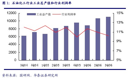 2006 年前三季度,石油化工行業(yè)作為我國宏觀經(jīng)濟(jì)的基礎(chǔ)和支柱產(chǎn)業(yè),繼續(xù)在自身的發(fā)展慣性作用下保持穩(wěn)定增長,但其增長速度相對于2004-2005 年高速增長期已經(jīng)有所回落。石化行業(yè)工業(yè)總產(chǎn)值已經(jīng)連續(xù)兩個季度突破萬億元大關(guān),但需要關(guān)注的是,行業(yè)利潤率在波動中已經(jīng)開始出現(xiàn)了下滑的趨勢,預(yù)計今年石化行業(yè)的行業(yè)利潤率在10.5%左右,相比于去年的11.3%下降近一個百分點(diǎn)。這一利潤率指標(biāo)的走向直接反映了石油化工行業(yè)在經(jīng)歷了近期高峰以后,開始進(jìn)入景氣回落周期。