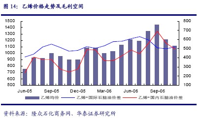 眾多石化下游子行業(yè)中,合成材料制造業(yè)產(chǎn)品與原油價(jià)格的相關(guān)性最大,因此受到原油價(jià)格波動(dòng)的影響也最為劇烈。這種影響在國(guó)際市場(chǎng)更多的是反映在產(chǎn)品價(jià)格上,國(guó)際市場(chǎng)乙烯價(jià)格與原油價(jià)格基本呈現(xiàn)一致的下降幅度,但以乙烯—石腦油價(jià)格衡量毛利空間基本上沒(méi)有太大的降幅。而在國(guó)內(nèi)卻更多的表現(xiàn)為行業(yè)利潤(rùn)上的下降,長(zhǎng)期的高成本影響到了合成材料制造業(yè)直接下游塑料、輪胎和化纖等子行業(yè)的需求。目前盡管原油價(jià)格在下滑,石化行業(yè)下游產(chǎn)品需求的增長(zhǎng)卻還存在滯后,無(wú)法直觀反映在合成材料價(jià)格的波動(dòng)上,致使合成材料制造業(yè)利潤(rùn)率反而有所下降。
