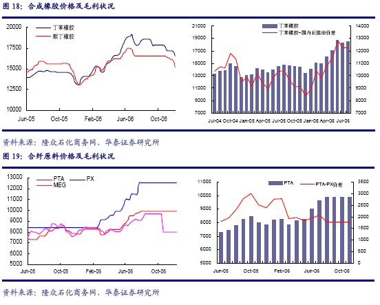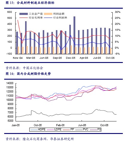 幾種主要產(chǎn)品中,合成樹(shù)脂的對(duì)外依存度一直較高,產(chǎn)能增長(zhǎng)與國(guó)內(nèi)需求增長(zhǎng)不相匹配,產(chǎn)品價(jià)格波動(dòng)不大,利潤(rùn)水平在近期反而有所提升;合成橡膠的價(jià)格在近幾個(gè)月來(lái)則是由于天膠供應(yīng)的增加持續(xù)下滑,毛利水平從前期的高位有所下降;合纖原料在下游需求進(jìn)入相對(duì)穩(wěn)定期后波動(dòng)不大。2007 年預(yù)計(jì)合成材料制造業(yè)的將會(huì)因?yàn)橄掠涡袠I(yè)景氣度的回升而有所恢復(fù),但難以與04-05 年的景氣高峰時(shí)相提并論。