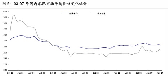 數(shù)據(jù)顯示,07年1-4月份水泥均價(PO42.5)同比上漲約7元/噸,而06年同期的漲幅約2元/噸,國內(nèi)水泥價格進一步回升的態(tài)勢明顯。??對07年國內(nèi)水泥價格年漲幅區(qū)間的判斷維持在3-4%的水平,相當(dāng)于8-10元/噸的價格上漲幅度。