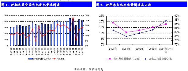 2007年1-4月,全國火電發(fā)電量為8330.9億千瓦時,同比增長17.6%,占全部發(fā)電量的比重高達(dá)87.3%,與06年相比,占比提高了4.2個百分點(diǎn)。從歷史數(shù)據(jù)可以看出,自2004年以來,火電發(fā)電量增速及其占全國總發(fā)電量之比呈上升趨勢。
