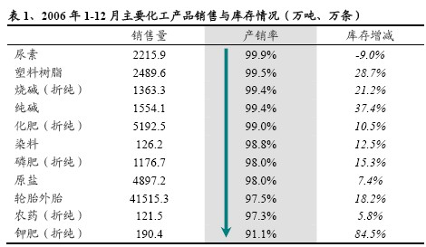 截至到去年12 月底,國內(nèi)大部分化工產(chǎn)品都保持著產(chǎn)銷兩旺的良好勢(shì)頭,產(chǎn)銷率多在90%以上。但是鉀肥、塑料樹脂、燒堿、純堿、輪胎、磷肥等產(chǎn)品的庫存增加較大,表明下游需求增速與產(chǎn)量增速仍有一定差距,除鉀肥嚴(yán)重產(chǎn)不足需以外,其他幾類產(chǎn)品都面臨著不同程度的供大于求。