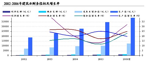 從建筑業(yè)(所有具有資質(zhì)等級(jí)的施工總承包、專業(yè)承包建筑企業(yè),但不包括勞 務(wù)分包建筑企業(yè))的統(tǒng)計(jì)數(shù)據(jù)來看,2003-2006年建筑業(yè)總產(chǎn)值穩(wěn)定增長(zhǎng),利 潤(rùn)、稅金增長(zhǎng)率在2005年出現(xiàn)低位拐點(diǎn),建筑行業(yè)的盈利能力有所好轉(zhuǎn) 。