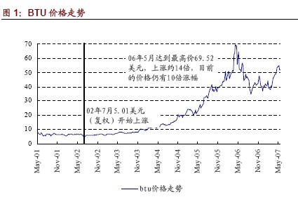 BTU,于2001 年5 月22 日上市,自02 年7 月的5.01 美元(復(fù)權(quán)價(jià))開始上漲,