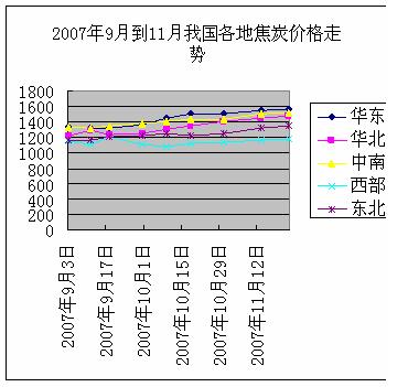 1.焦炭價格不斷上漲 在07年9月份,焦炭市場行情步入大幅上漲的局面,部分焦化企業(yè)已經(jīng)調(diào)整30至50元/噸左右,隨后華東及河北部分地區(qū)上漲30至40元/噸,東北地區(qū)也在觀望后也上調(diào)50元/噸左右。另外,華北地區(qū)的焦化企業(yè)經(jīng)過艱苦談判,“八五”之爭在鋼廠用戶接受80元/噸漲幅的協(xié)議下結(jié)束。至此,焦炭市場新的一輪價格上漲基本完成,市場逐漸進入盤整局面。10月到11月中旬,全國的焦炭價格保持了比較穩(wěn)定的增長態(tài)勢(參見下圖);诿禾糠植嫉牟黄胶,各地的市場價格每噸也相差十幾元到上百元不等,尤其是焦炭需求比較旺盛的華東地區(qū)和煤炭資源豐富的地區(qū)基本保持了每噸上百元的差距。