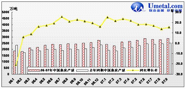 在2007年9月份,全國焦炭產(chǎn)量為2890.25萬噸,,較8月份的2,795.84萬噸增加了4.16萬噸,10月全國焦炭產(chǎn)量為2854.28萬噸,相比9月份有少量的減少。1至8月全國累計生產(chǎn)焦炭 21,298.83萬噸,較06年同期相比增長20.1%。雖然焦炭產(chǎn)量依舊保持快速增長,但增幅保持穩(wěn)步回落態(tài)勢,主要是因為目前在國家政策及煤炭市場資源緊價格高的情況下,焦炭的產(chǎn)能釋放受阻,產(chǎn)量有所降低。