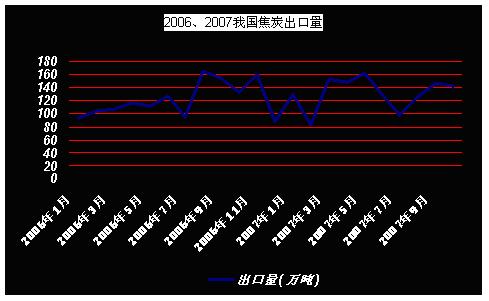 在煤炭出口方面自2006年以來,我國焦炭雖然有一定的波動,但在相對穩(wěn)定,在經(jīng)歷了2007年7月份的出口低峰后,8月份焦炭出口量再次增加。據(jù)海關(guān)數(shù)據(jù)顯示,2007年8月份國內(nèi)出口焦炭124萬噸,較7月增加26.31萬噸,環(huán)比增加 27%;較06年8月份減少40.42萬噸,同比減少25%。2007年1至8月,累計出口焦炭1,027萬噸,同比增加12.1%,累計金額 181,682.6萬美元,同比增加49.2%。9月份和10月份基本保持了8月份的增長勢頭,出口焦炭分別為142萬噸、140萬噸。