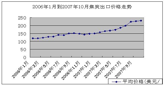 在焦炭出口的價格方面,從2006年以來,焦炭的出口價格一直保持了穩(wěn)定的增長勢頭。從下圖中可以看出,在近期,即2007年8月焦炭的價格有了一個比較大的提升,從前幾個月的幾美元、十幾煤炭的上漲幅度,激增到8月份二十多美元的上調(diào),而且在出口量上8月份也是我國出口大量增加的拐點,這反映出國際市場對中國焦炭的依賴程度加深。
