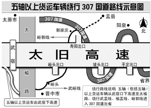 太舊高速公路全線雙向晝夜禁止5軸(含5軸、懸浮軸)以上貨運車輛通行。該如何繞行呢?交警提示,5軸(含5軸以上)貨運車輛從武宿口下高速至太榆路,繞行武盂、榆盂線,峪郭線,進(jìn)入307國道出省。