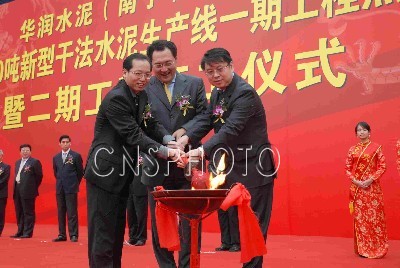 十二月二十六日,華潤(rùn)水泥(南寧)日產(chǎn)四千噸新型干法水泥生產(chǎn)線在廣西南寧正式點(diǎn)火投產(chǎn),同時(shí)第二條生產(chǎn)線也順利開工建設(shè)。該項(xiàng)目總投資十三點(diǎn)五億元,兩條生產(chǎn)線全部建成投產(chǎn)后,將形成年產(chǎn)水泥熟料三百三十萬(wàn)噸、水泥四百萬(wàn)噸的生產(chǎn)能力,預(yù)計(jì)年銷售收入十億元。圖為華潤(rùn)(集團(tuán))有限公司總經(jīng)理宋林(中)出席點(diǎn)火儀式。