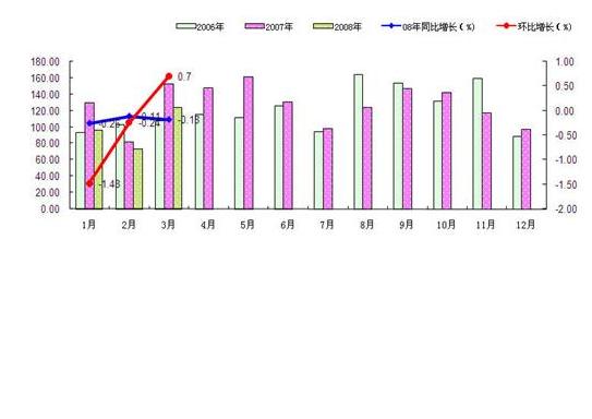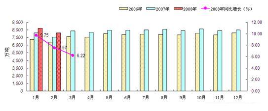 2008年3月生鐵總產(chǎn)量較2月份相比有所增長(zhǎng),日均產(chǎn)量再創(chuàng)歷史新高。據(jù)國(guó)家統(tǒng)計(jì)局最新生產(chǎn)統(tǒng)計(jì)數(shù)據(jù)顯示:2008年3月份,全國(guó)生鐵產(chǎn)量為4152.99萬(wàn)噸,較2月份的3754.14萬(wàn)噸增加了398.85萬(wàn)噸,本月較去年同期增長(zhǎng)335.14萬(wàn)噸,同比增長(zhǎng)8.8%;按照日均產(chǎn)量來(lái)算,3月份為133.97萬(wàn)噸,較2月份的129.45萬(wàn)噸增長(zhǎng)了4.52萬(wàn)噸。2008年1-3月全國(guó)累計(jì)生產(chǎn)生鐵11780.14萬(wàn)噸,較去年同期相比增長(zhǎng)7.6%,3月份日均產(chǎn)量較2月份相比略有增長(zhǎng),再創(chuàng)歷史新高。參考圖3: