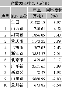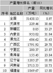 在經(jīng)濟(jì)快速發(fā)展的拉動(dòng)下,水泥產(chǎn)量51,438.13億噸,同比增長(zhǎng)8.97%,熟料產(chǎn)量35,111.07萬(wàn)噸,同比增長(zhǎng)8.58%。山東省以5,600.99萬(wàn)噸的水泥產(chǎn)量位居各省市(區(qū))第一,但是連續(xù)幾個(gè)月同比增長(zhǎng)為負(fù),其熟料產(chǎn)量為3,166.13萬(wàn)噸。