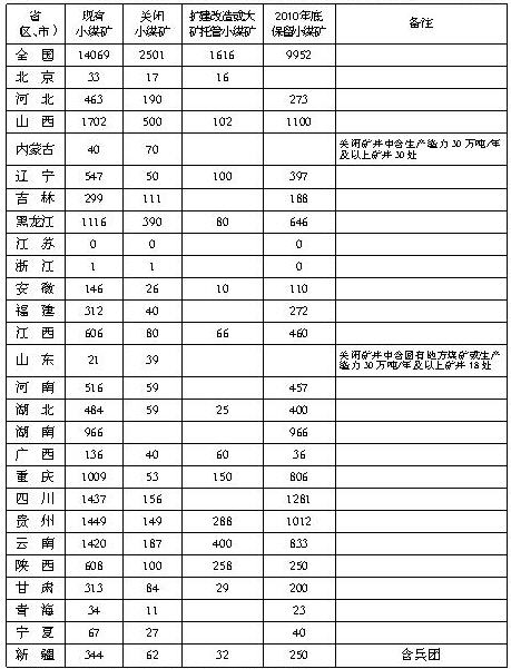 一、各地要在省級(jí)人民政府統(tǒng)一領(lǐng)導(dǎo)下,按照“提高門檻、嚴(yán)格準(zhǔn)入,打擊非法、淘汰落后,資源整合、提高檔次,大礦托管、提升水平,明確責(zé)任、加強(qiáng)監(jiān)管”的總體要求,將本地區(qū)現(xiàn)有小煤礦通過(guò)淘汰落后關(guān)閉一批,擴(kuò)能改造提高一批,大礦托管(包括兼并、收購(gòu)、租賃)提升一批,到2010年底確保完成保留小煤礦數(shù)量目標(biāo)。