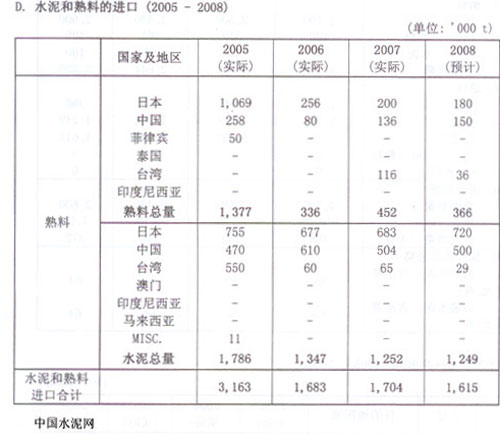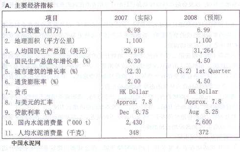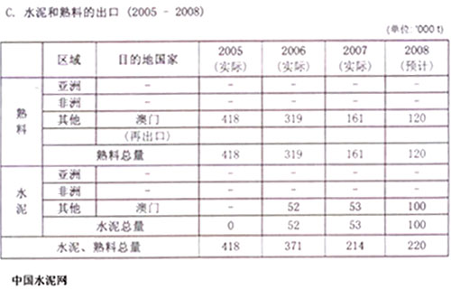 由于廣東省水泥市場(chǎng)漸好轉(zhuǎn),與及由人民幣匯率變動(dòng)及取消出出口退稅所引致的出口成本增加,我們估計(jì)競(jìng)爭(zhēng)情況應(yīng)可緩和。雖然如此,業(yè)界仍面對(duì)高通脹與及高能源成本的問(wèn)題。目前香港的袋裝及散裝水泥送到工地價(jià)格每噸約為500港元或64美元。