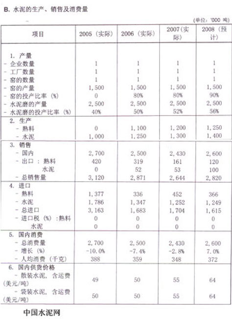 2007年水泥用量為243萬(wàn)噸,對(duì)比2006年下跌6%。我們預(yù)計(jì)2008年將會(huì)有大約7%的升幅,至260萬(wàn)噸,人均消耗量為373公斤,仍處于極低水平。