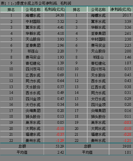 如表1所示,1~3季度22家水泥上市企業(yè)累計(jì)實(shí)現(xiàn)毛利潤(rùn)53.29億元,平均值為2.42億元;實(shí)現(xiàn)凈利潤(rùn)39.88億元,平均值為1.81億元。因此,有70%以上的企業(yè)處于總盈利能力平均水平以下,大同水泥、福建水泥、秦嶺水泥均為虧損狀態(tài),大同水泥甚至于發(fā)布控股股東破產(chǎn)清算的公告。