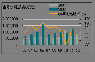 水泥投資在11月扭轉(zhuǎn)了10月份的同比增長(zhǎng)速度探底,當(dāng)月投資12.56億元,環(huán)比增長(zhǎng)37.47%,與07年同比增長(zhǎng)80.61%