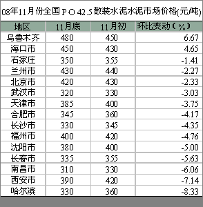 東北地區(qū)開始進(jìn)入冬季,受施工暫停影響,哈爾濱價(jià)格下降了30元/噸,降幅超過8%。沈陽(yáng)和長(zhǎng)春兩地的價(jià)格也下降超過5%。南昌市延續(xù)10月份的跌勢(shì),跌幅超過6%。