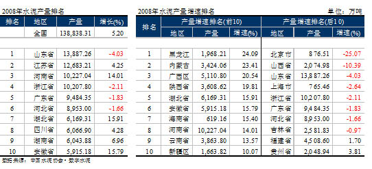 地區(qū)分布上,黑龍江、內(nèi)蒙古、廣西在區(qū)域內(nèi)經(jīng)濟拉動下,增速超過20%以上,河南水泥產(chǎn)量首次突破1億噸,沖進全國三甲;8個省出現(xiàn)負增長,產(chǎn)量大省山東、浙江、廣東和河北均在其中,也是2008年全國水泥產(chǎn)量較2007年增速下降的主要原因。