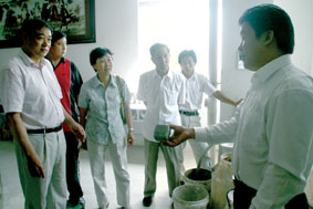 在“新型無(wú)機(jī)輕質(zhì)充填材料及在煤礦井下的應(yīng)用”成果鑒定會(huì)現(xiàn)場(chǎng),鑒定會(huì)主任委員、國(guó)家瓦斯治理專家俞啟香(左四)、鑒定會(huì)副主任委員、宿州學(xué)院院長(zhǎng)桂和榮(左一)、鑒定會(huì)成員皖北煤電集團(tuán)副總工程師司春風(fēng)(左二)、宿州市科技局副局長(zhǎng)盛國(guó)英(左三),聽(tīng)取安徽金鼎煤炭責(zé)任有限公司總經(jīng)理、宿州市金鼎安全技術(shù)研究所所長(zhǎng)蔡長(zhǎng)輝(右一)對(duì)產(chǎn)品的介紹。