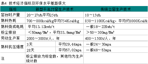 由表1~表4可以清楚看出:JT窯技術(shù)與傳統(tǒng)立窯的窯爐結(jié)構(gòu)、配料方案、操作方法、生產(chǎn)工藝等都有絕然不同之處,正是這種不同才導(dǎo)致了技術(shù)經(jīng)濟(jì)指標(biāo)先進(jìn)與落后的差距。因此把新型半干法JT窯水泥生產(chǎn)技術(shù)視為落后的傳統(tǒng)立窯技術(shù)是不妥的,新型半干法JT窯技術(shù)≠傳統(tǒng)立窯。
