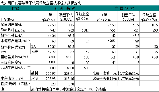 根據(jù)新型半干法JT窯水泥生產(chǎn)技術(shù)的特點(diǎn),它的技術(shù)定位是適合中小水泥企業(yè)的先進(jìn)技術(shù)。不是與大型經(jīng)濟(jì)規(guī)模新型干法的競爭技術(shù),而是新型干法技術(shù)的補(bǔ)充。因?yàn)樾滦透煞夹g(shù)是大型化技術(shù),生產(chǎn)水平受生產(chǎn)線規(guī)模制約,2000t/d以下生產(chǎn)線的技術(shù)經(jīng)濟(jì)指標(biāo)并不先進(jìn),因此不適合中小水泥企業(yè)。新型半干法JT窯水泥生產(chǎn)技術(shù)正好適合600~1500t/d規(guī)模,填補(bǔ)了新型干法技術(shù)不適合中小水泥企業(yè)的技術(shù)空白,也為水泥工業(yè)產(chǎn)業(yè)政策提供了中小水泥企業(yè)的支撐技術(shù)。通過江蘇磊達(dá)、廣西華宏既有新型干法生產(chǎn)線,又有JT窯生產(chǎn)線兩廠的生產(chǎn)實(shí)踐,有力的證明了新型半干法水泥生產(chǎn)技術(shù),是適用于中小水泥企業(yè)的先進(jìn)技術(shù)。現(xiàn)將兩廠實(shí)際生產(chǎn)技術(shù)經(jīng)濟(jì)指標(biāo)能列入表5: