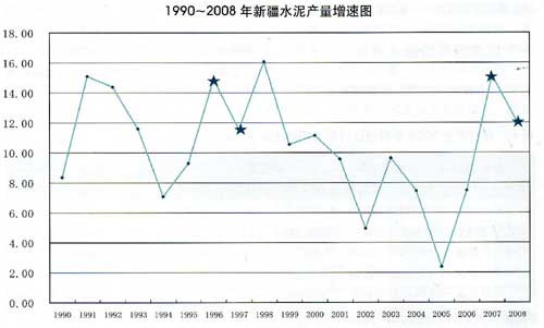 從1990~2008年的統(tǒng)計(jì)數(shù)據(jù)看,1998年水泥產(chǎn)量增速最高達(dá)16.07%,2005年水泥產(chǎn)量增速最低僅僅為2.37%;這18年的年均增長率為10.43%,“八五”期間水泥產(chǎn)量年均增速為11.44%,“九五”期間水泥產(chǎn)量年均增速為12.83%,“十五”期間水泥產(chǎn)量年均增速為6.75%,“十一五”前三年水泥產(chǎn)量年均增速11.04%.2007、2008年新疆水泥產(chǎn)量增長率與亞洲經(jīng)濟(jì)風(fēng)暴前兩年水泥產(chǎn)量增速相比有驚人的相似,都保持了12%以上的高速增長。從全疆水泥運(yùn)行規(guī)律看,2009年水泥產(chǎn)量高速增長是可能的!笆濉逼陂g新疆水泥產(chǎn)量年均增速6.75%,遠(yuǎn)低于“八五”、“九五”期間水泥產(chǎn)量增速,也低于歷年平均增速,“十一五”期間水泥產(chǎn)量高速增長是符合經(jīng)濟(jì)運(yùn)行規(guī)律的。