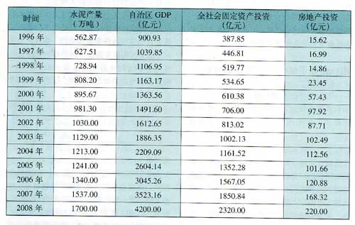 自治區(qū)提出要確保2009年全區(qū)GDP增長在9%以上,固定投資增長25%.因此預(yù)計(jì)2009年全區(qū)的GDP達(dá)4500億元,全社會(huì)固定投資2900億元,房地產(chǎn)投資195億元(數(shù)據(jù)來源:區(qū)房產(chǎn)協(xié)會(huì)專家),全區(qū)水泥需求量為1904萬噸。
