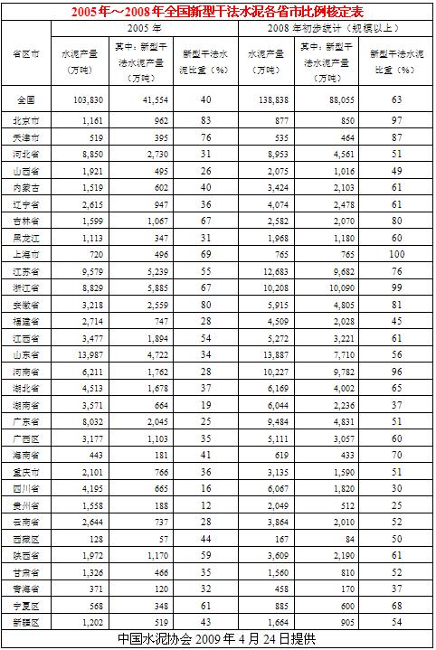 2009年4月中國(guó)水泥協(xié)會(huì)經(jīng)過與各省市自治區(qū)協(xié)會(huì)、行管辦及部分大企業(yè)逐一核對(duì),初步完成截止2008年底,各省市自治區(qū)新型干法水泥比重表。
