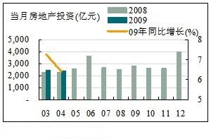 2009年房地產(chǎn)市場盡管仍舊低迷,但表現(xiàn)要好于預(yù)期,較上年出現(xiàn)小幅的同比上漲。4月份當(dāng)月實現(xiàn)房地產(chǎn)投資2,409.69億元,同比增長6.42%,累計投資達(dá)7,289.98億元,同比增長4.9%。