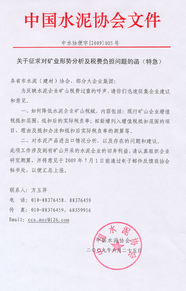 關(guān)于征求對礦山形勢分析及稅費負擔(dān)問題的函(特急)