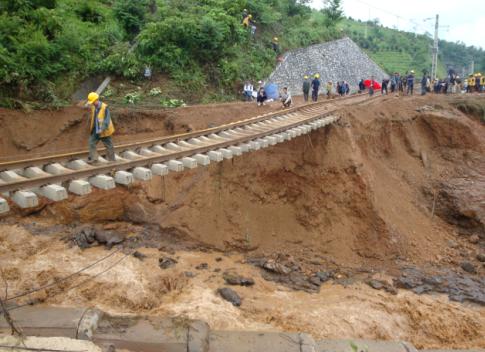 連日來,貴州省六盤水市烏蒙山區(qū)一帶連降暴雨,大面積山洪爆發(fā),僅6月29日白天,水紅鐵路工務(wù)防洪值班人員巡查線路時(shí)就發(fā)現(xiàn)K36+828、K48+020、K49+700、K50+100、K51+500、K54+100等六處險(xiǎn)情,并迅速組織力量排除了險(xiǎn)情。確保了列車安全暢通運(yùn)行。但由于暴雨不斷,位于K48+020處山頂上的馬場(chǎng)水庫發(fā)生潰壩事故,導(dǎo)致山洪暴發(fā),沖毀水紅鐵路(法耳至茅草坪區(qū)間),導(dǎo)致水紅鐵路中斷運(yùn)行。災(zāi)情發(fā)生的第一時(shí)間,中鐵五局六公司水紅工務(wù)項(xiàng)目部拉響了警鈴,啟動(dòng)了防洪應(yīng)急預(yù)案,迅速組織300多搶險(xiǎn)隊(duì)員冒雨趕到事發(fā)現(xiàn)場(chǎng),及時(shí)展開搶險(xiǎn)。昆明鐵路局接到災(zāi)情報(bào)告后,副局長(zhǎng)牛道安立即趕赴現(xiàn)場(chǎng)指揮搶險(xiǎn),成立了搶險(xiǎn)應(yīng)急領(lǐng)導(dǎo)小組,制定了搶險(xiǎn)應(yīng)急方案:決定搶險(xiǎn)隊(duì)員兵分三路,一路上山分流洪水,一路疏通鐵路下的涵洞,另一路加工鋼筋籠裝片石填路基,目前搶險(xiǎn)工作在緊張進(jìn)行,預(yù)計(jì)一周內(nèi)恢復(fù)水紅鐵路正常運(yùn)行。
