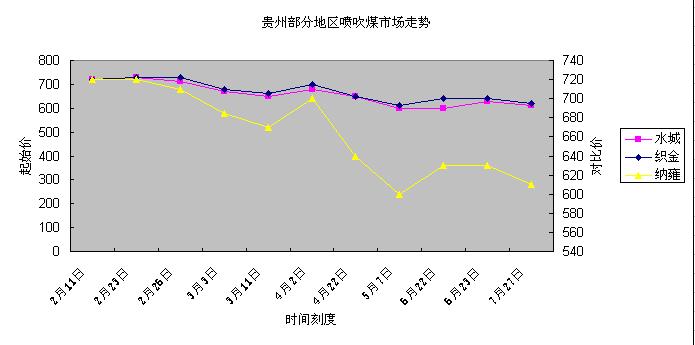 水城灰分小于13.5的煙噴煤下調(diào)20元站臺(tái)不含稅價(jià)610元/噸;畢節(jié)織金灰分小于13的無煙噴煤下調(diào)20元站臺(tái)不含稅價(jià)620元/噸,畢節(jié)納雍地區(qū)灰分小于13.5的無煙噴煤價(jià)格下調(diào)20元站臺(tái)不含稅價(jià)610元/噸。