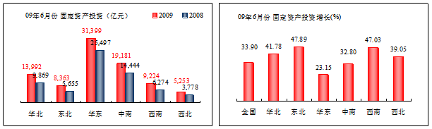受4萬(wàn)億投資拉動(dòng)影響,09年1~6月份全國(guó)固定資產(chǎn)投資78,098億元,同比增長(zhǎng)33.9%,走勢(shì)強(qiáng)勁。華東地區(qū)投資額31,399億元,占全國(guó)35%;中南地區(qū)投資額19,181億元,占全國(guó)22%。華東、中南地區(qū)增速都低于全國(guó),其中華東地區(qū)增速比全國(guó)低了10個(gè)百分點(diǎn)。