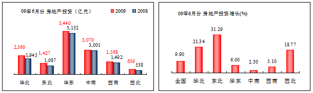 09年1~6月份房地產(chǎn)投資14,505億元,同比增長(zhǎng)9%,表現(xiàn)超預(yù)期。華東地區(qū)房地產(chǎn)投資額5,440億元,占全國(guó)38%;中南投資額3,070億元,占全國(guó)21%。華東、中南和西南同比增長(zhǎng)均低于全國(guó)水平,中南地區(qū)受廣東市場(chǎng)低迷影響,增幅最低。