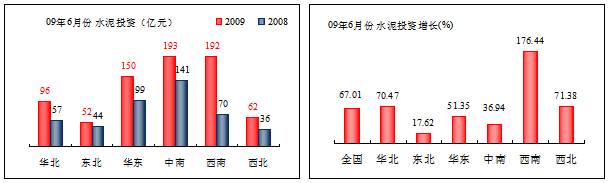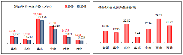 受投資拉動(dòng),09年1~6月份水泥產(chǎn)量73,462萬(wàn)噸,同比增長(zhǎng)15%,其中六月份當(dāng)月水泥產(chǎn)量15,759萬(wàn)噸,再創(chuàng)月產(chǎn)量新高,預(yù)計(jì)今年底全國(guó)產(chǎn)量將接近16億噸。華東地區(qū)產(chǎn)量27,349萬(wàn)噸,占全國(guó)37%,中南地區(qū)產(chǎn)量19,138萬(wàn)噸,占全國(guó)26%;華東地區(qū)產(chǎn)量增速低于全國(guó)增速7個(gè)百分點(diǎn),西南、東北、西北地區(qū)產(chǎn)量增速均都超過(guò)20%;