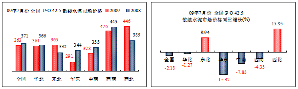 受兩方面因素影響,09年全國(guó)水泥價(jià)格總體略低于去年水平。一是內(nèi)部因素,去年水泥產(chǎn)能增長(zhǎng)過(guò)快,超過(guò)了需求上升的速度,造成了有市無(wú)價(jià)。二是外部因素,煤炭?jī)r(jià)格同比處于相對(duì)低位為水泥價(jià)格的下移提供了一定空間。但不同地區(qū)的差別較大,西北和東北地區(qū)價(jià)格上揚(yáng),西北地區(qū)價(jià)格比去年增長(zhǎng)了60元/噸,增幅達(dá)15.95%,華東和中南地區(qū)價(jià)格下降,華東地區(qū)價(jià)格比去年下降了15.37%。