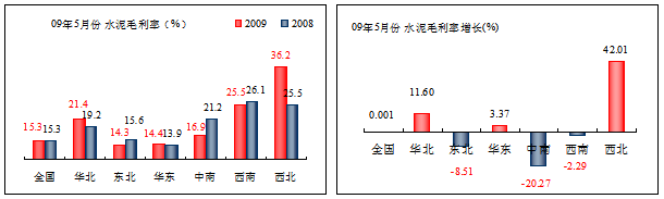 09年1~5月全國(guó)水泥毛利率和去年持平,西北、西南和華北地區(qū)毛利率均超過(guò)20%,西北高達(dá)36%。但中南地區(qū)下跌,降幅較大;華東地區(qū)表現(xiàn)要好于去年同期。