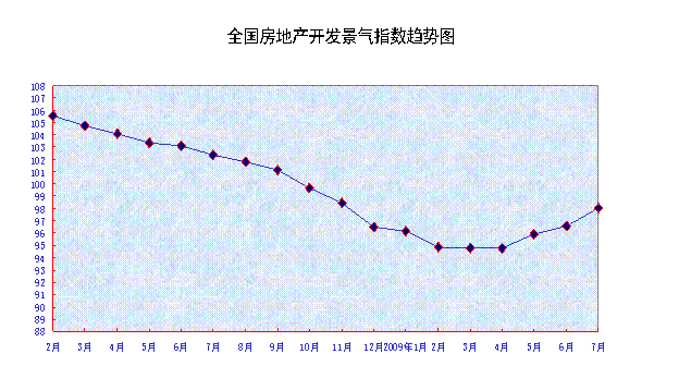 7月份,全國(guó)房地產(chǎn)開發(fā)景氣指數(shù)(簡(jiǎn)稱“國(guó)房景氣指數(shù)”)為98.01,比6月份提高1.46點(diǎn)。