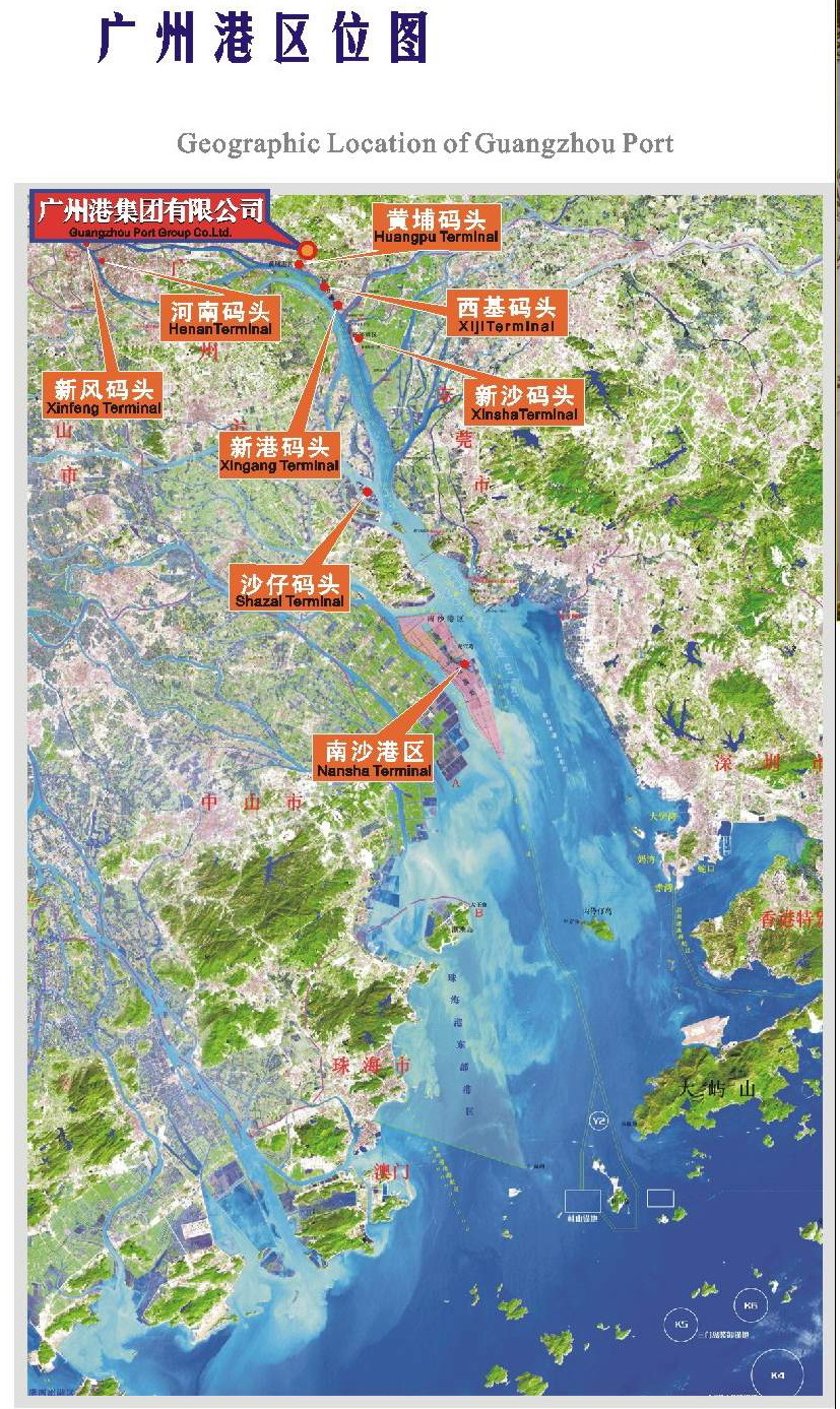 共分為以下8個碼頭:黃埔集裝箱專用碼頭、西基煤炭專業(yè)碼頭、黃埔雜貨碼頭、南沙一期集裝箱碼頭、南少二期儲裝箱碼頭、新沙碼頭、河南港務(wù)分公司、新風(fēng)港務(wù)分公司。